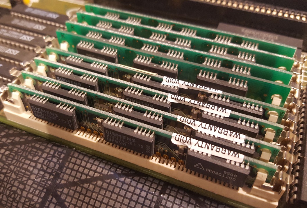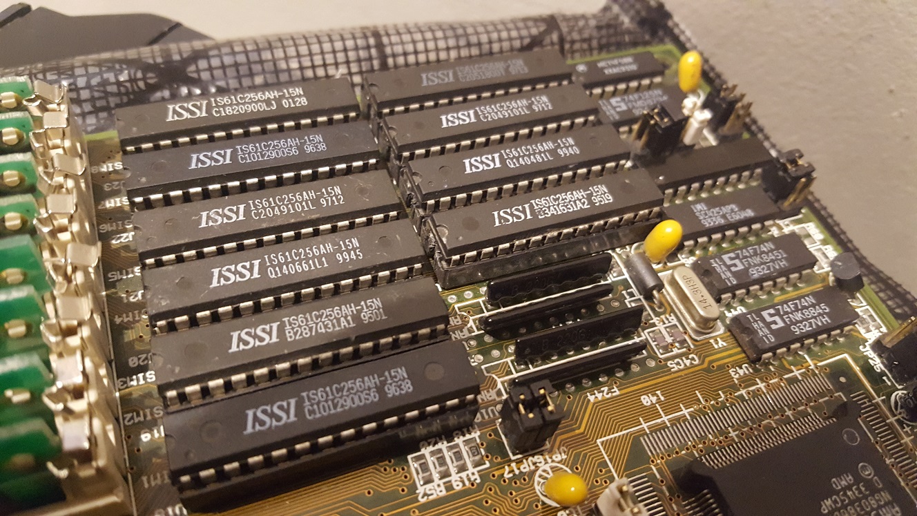 The motherboard came with 4 MB of 70 nanosecond SIMMs in bank 0. I dug out a further 4 MB, also 70 ns and installed them in bank 1. Some boards don't like mixing memory of differing speeds, even in different banks. This won't give much, if any, performance gains, but does mean we can run more demanding games up to around 1994 if coupled with a CPU upgrade. All benchmark tests were done with this 8 MB installed: