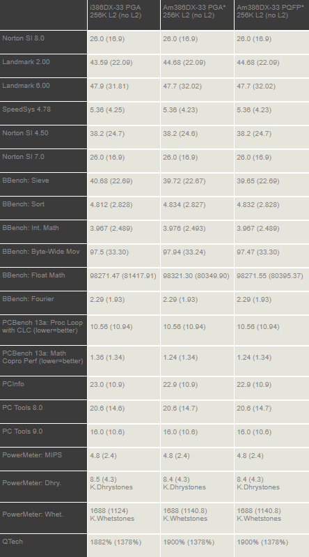The first benchmark numbers in the table are with 256 KB of L2 cache enabled. The numbers in brackets are those with the L2 cache disabled. All the above 386 CPU tests were performed with a Cyrix 8C387-33 math coprocessor installed. BIOS settings included 0 wait states for memory read and memory write, and 1 wait state for L2 cache read and write.