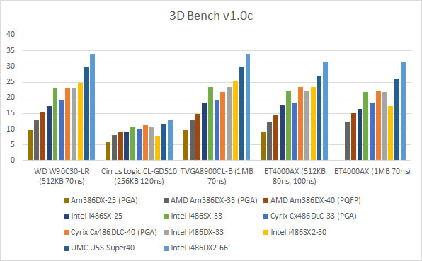 Starting with 3D Bench v1.0, also known as the Superscape Benchmark, the Cyrix Cx486DLC-40 stands up well against an Intel 486 at 33 MHz on most video cards. The CL card shows its bottlenecking 8-bit ISA bus, as the 386 and 486 are so closely-matched. The UMC U5S Super40 is an awesome chip considering it's not clock-doubled and was very cheap to buy!