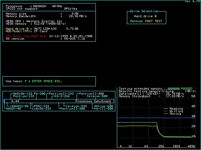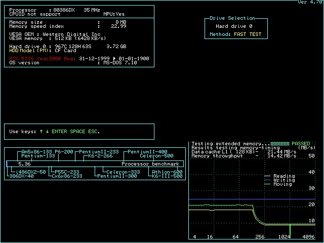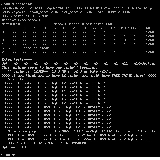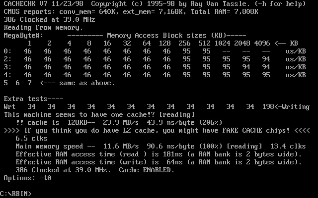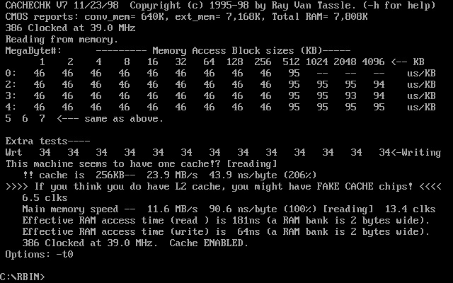 CacheChk v7 correctly identified the 8 KB of L1 cache in the CPU, but failed to identify the L2 cache on the motherboard. The L1 cache throughput came out at 25.4 MB/s. Main memory speed of 14.4 MB/s (72ns/byte), with an average read access time of 291ns and average write access time of 208ns.