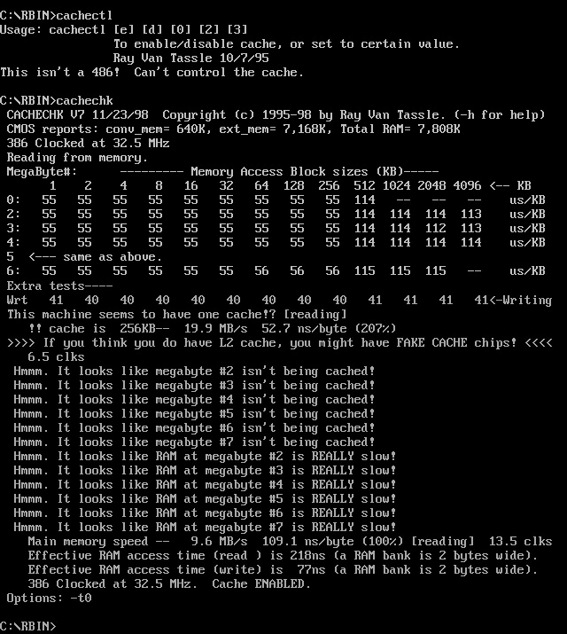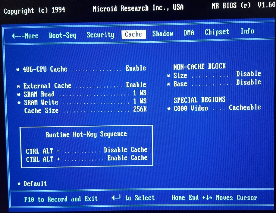The MR BIOS on this mobo is 'Cyrix DLC aware', and it provides a setting to enable or disable the L1 cache. I double-checked the cache is enabled/disabled by using the Cyrix Cx486DLC utility which allows you to tweak the CPU registers directly, as there have been reports of some 'Cyrix aware' motherboards failing to enable the cache correctly.