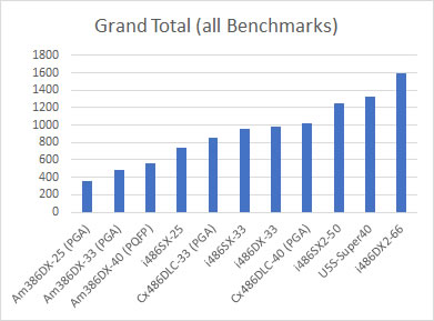 Well the good news is the new socket I fitted seems to work just fine. I ran 21 benchmarks with the i386DX-33 installed in it, then with a PGA version of the AMD Am386DX-40 (underclocked to 33 MHz to match the Intel), and then without any CPU in the PGA socket so it runs the embedded AMD CPU underclocked to 33 MHz. I'll get to the Cyrix in a bit... Incidentally, there is no way for software to distinguish between an AMD Am386 and an Intel 80386 apart from clock speed (if running the Am386 at 40 MHz, since Intel never released a 386 faster than 33 MHz), so a 33 MHz Intel and a 33 MHz AMD will appear to be identical to the software.