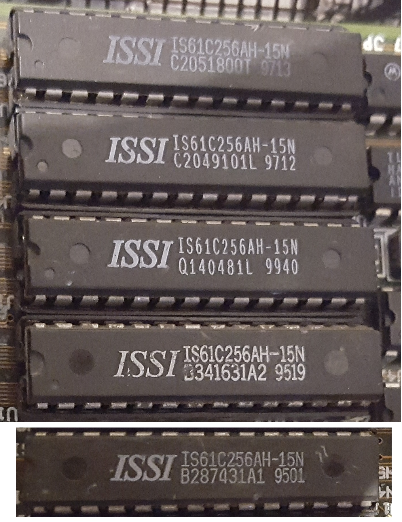 Having installed 5 of them I discovered the top 2 in the rightmost two images above simply don't work - the machine wouldn't POST. The 5 on the left seem to work just fine - I installed 4 of them in bank 0 and the bottom one replaced a 20ns Samsung in the Tag RAM socket. So the board is now populated with 256 KB of 15 nanosecond L2 cache!
