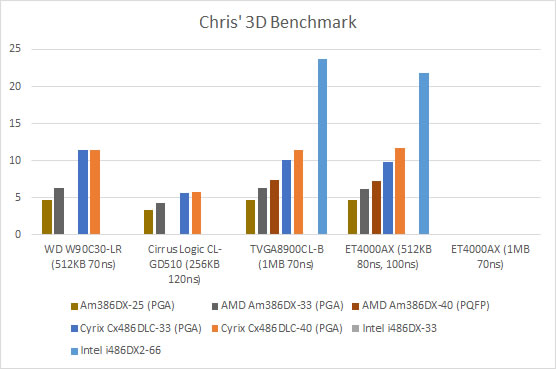 Chris' 3D Benchmark only works on machines that have a math coprocessor, so we can rule out all the SX units from our tests. The results show how much clock-doubling improves the performance on this benchmark.