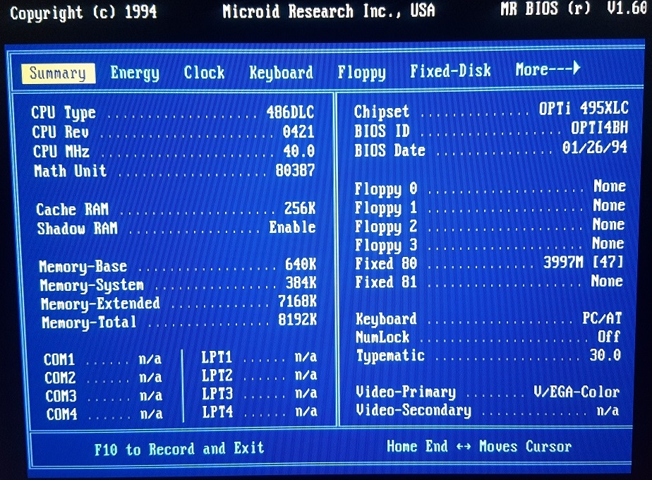 With the Intel 80486SX-33, I was able to run the cache at "Fast (2-1-1-1)" with 0 wait states. Memory wait states were both overridden to run at 0 WS (the default is 1 WS), just like I did for the Am386DX-40. I also ran the ISA bus at an overclocked 11.1 MHz.
