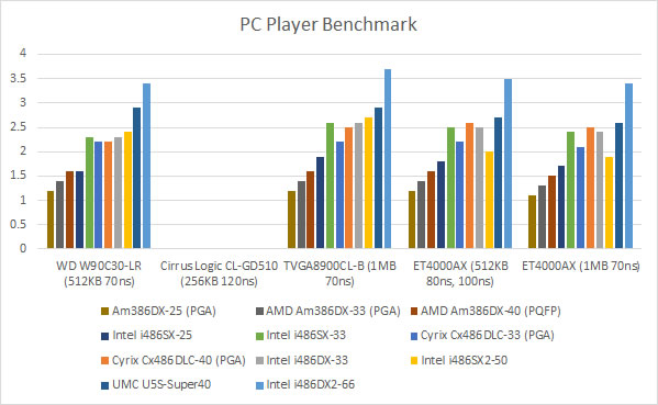 PC Player was run using the default VESA mode 100, which is 640 x 400 x 8 bits per pixel. The exception to this was the Western Digital card which did not have mode 100, so mode 101 was used instead (640 x 480 x 8 bpp).