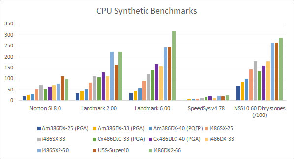 The clock-doubled CPUs are of course the fastest here along with the UMC 40 MHz which gets its bump in speed via internal efficiencies over Intel's design. The Cyrix Cx486DLC-40 "upgrade" processor takes a distant 4th place, much more on par with the Intel 486-33s.