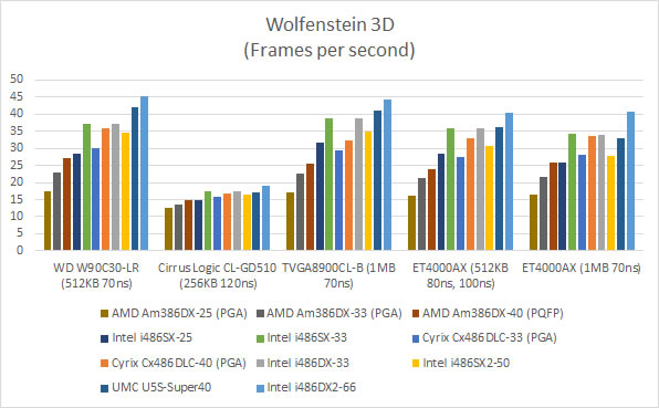 Because Doom does not make use of a math coprocessor, having a DX over an SX gives no benefit. The slight FPS differences when comparing 486SX-33 and 486DX-33 are due to slightly different BIOS settings (cache timings). The Trident card is [rather oddly for them] a solid performer though is let down by its inability to run on an overclocked ISA bus. If it weren't for this, it would be slightly faster than the ET4000. Of course, the Cirrus Logic card brings up the rear due to its 8-bit bus. The Western Digital again proves itself to be an excellent ISA card. One consistent surprise is the 1 MB ET4000 being slower than the 512 KB variant (same card, 70ns RAM taken off the Trident card).