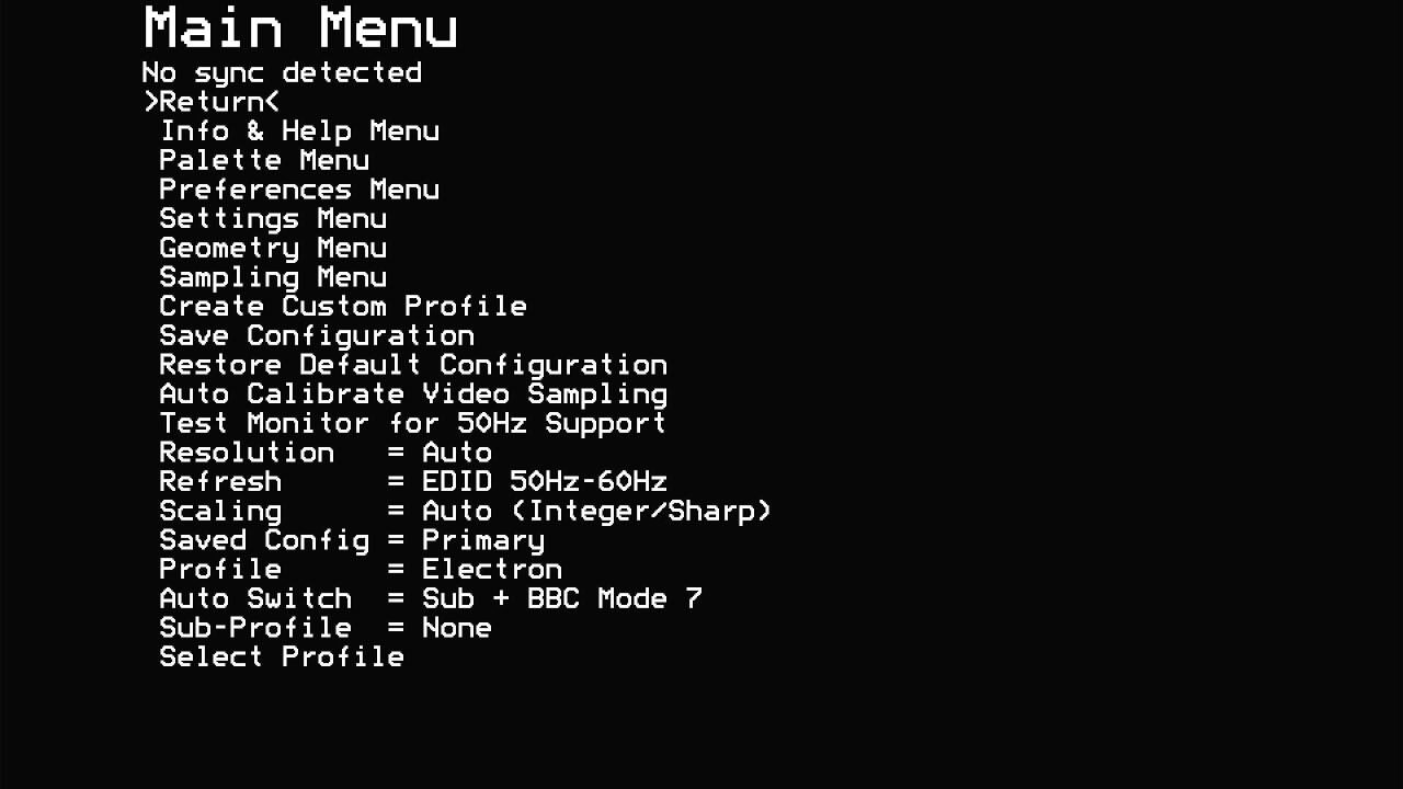 Out of the box, my RGBtoHDMI was configured to use the Acorn Electron profile (or maybe just because that's the first one in the list). Pressing the button again brings up the Main Menu.