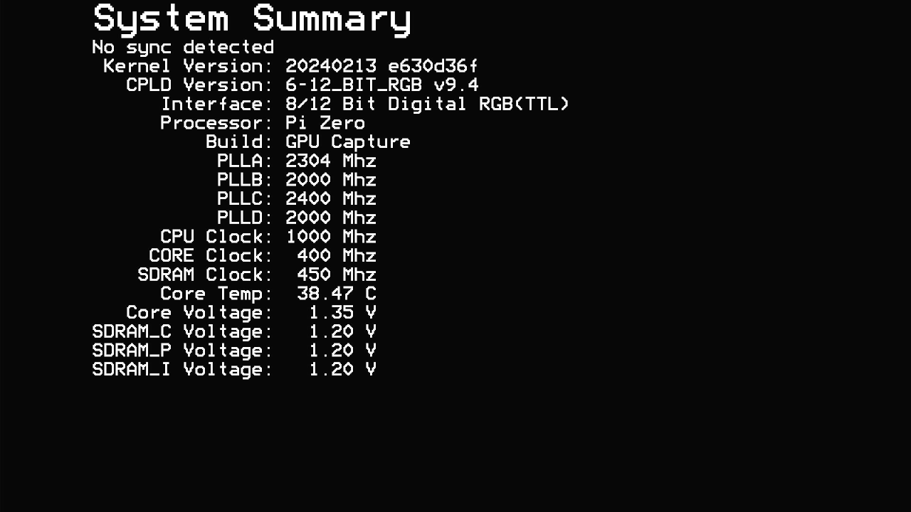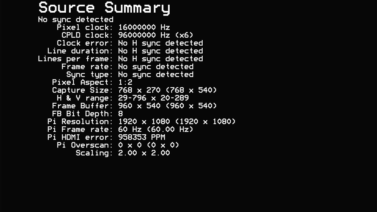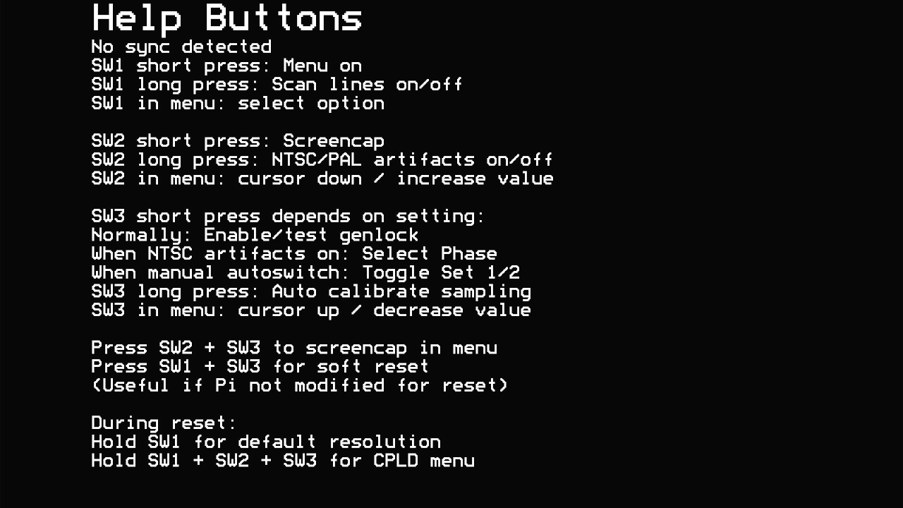Without any source connected, you can still access the OSD by pressing SW1 (the leftmost button) on the top of the RGBtoHDMI, and then use SW2 and SW3 to move around the menus, with SW1 selecting an option. Here are some screenshots of the OSD: