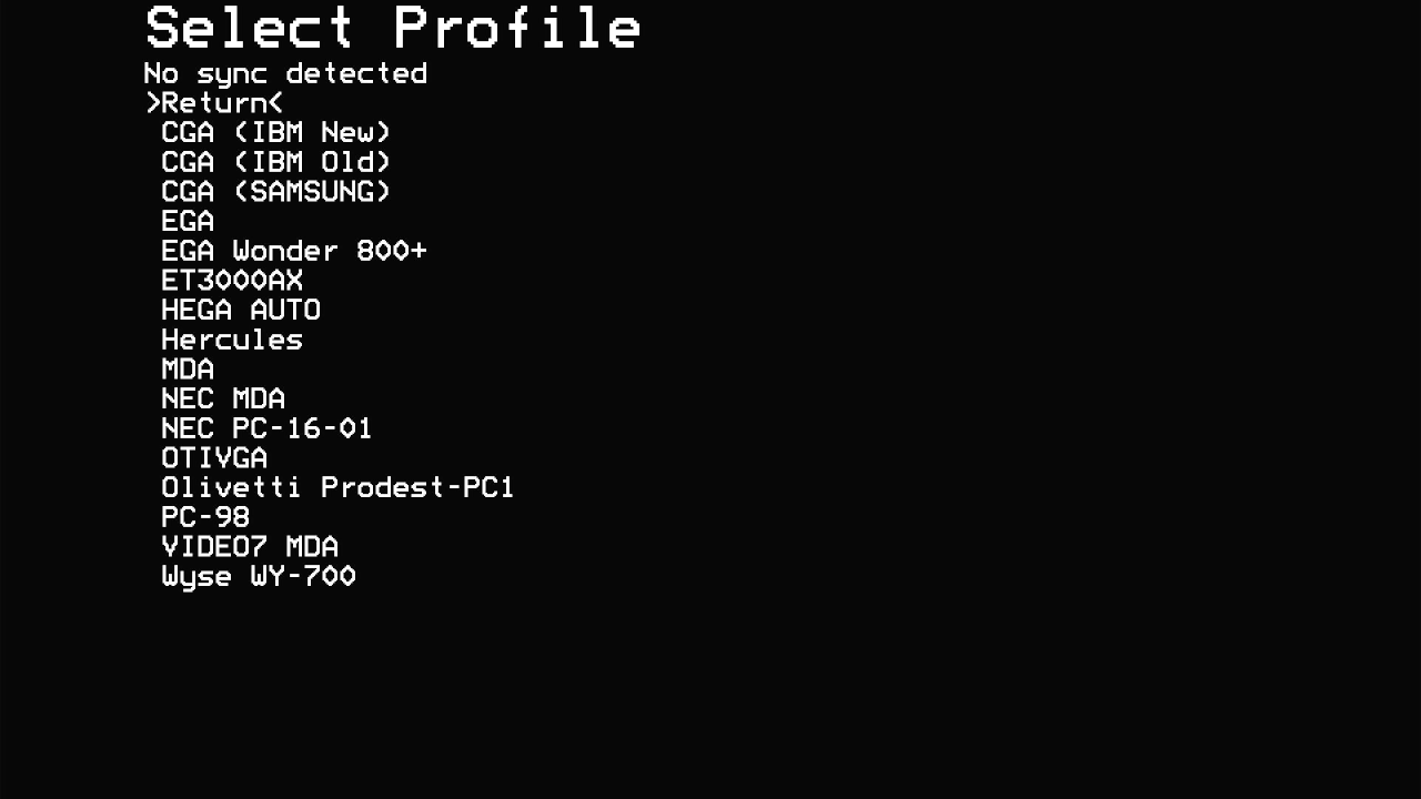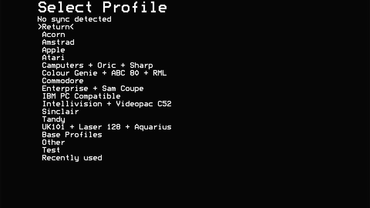 • Profiles - this allows all settings to be saved and recalled quickly for different requirements - great if you plan to use the RGBtoHDMI on a number of different systems, or in my case, a lot of different MDA/Hercules/CGA and EGA cards. Sub-profiles also exist to keep the menu system clean.