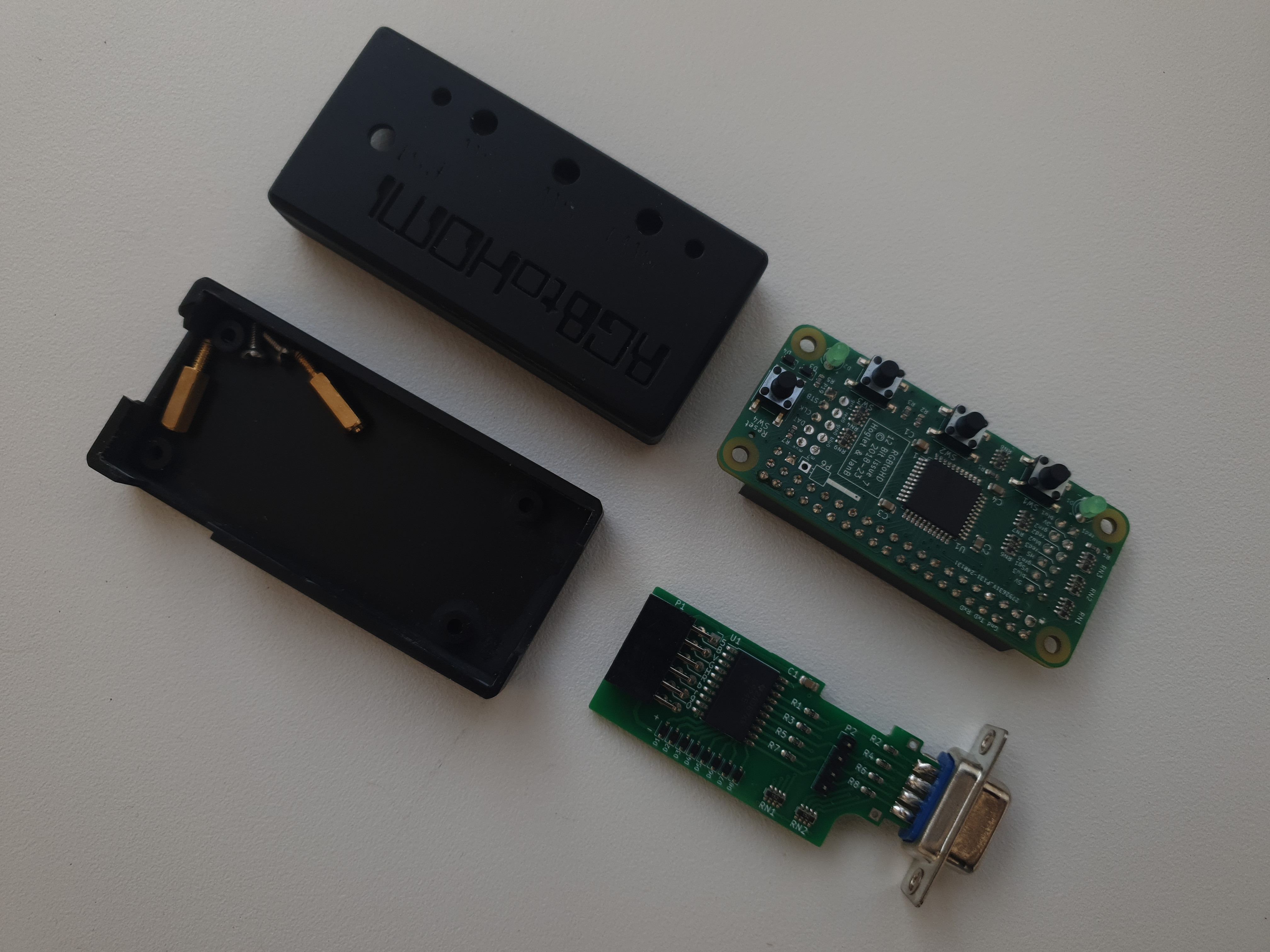 The 12-bit RGBtoHDMI, plastic case, and optional TTL buffer for IBM PC