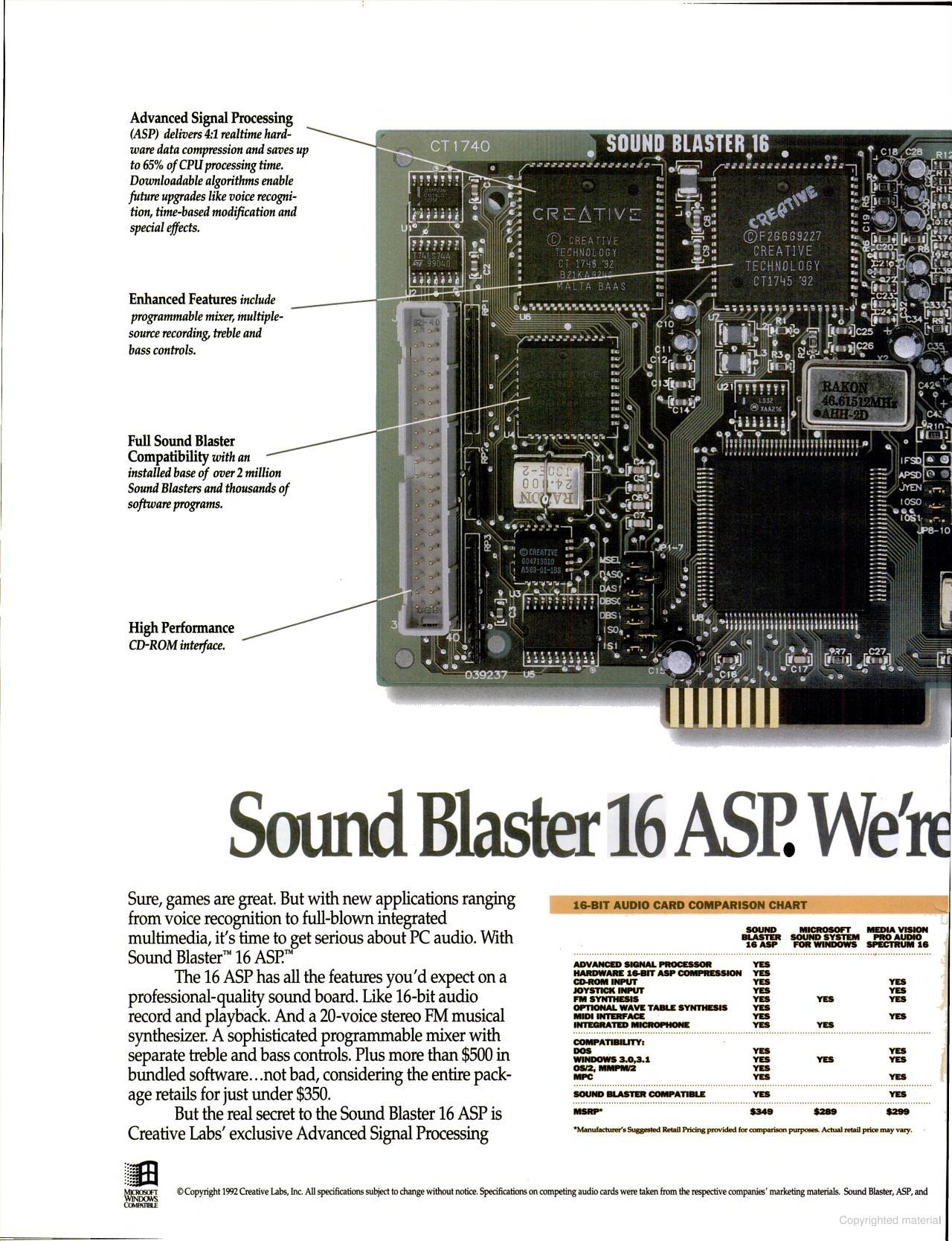 In June 1992, the Sound Blaster 16 was introduced as the successor to the Sound Blaster Pro, though the Pro was sold for a number of years alongside the SB16. The first '16' model was CT1740. For the first time you could get a Sound Blaster card with CD-quality (44 kHz) digital audio sampling.