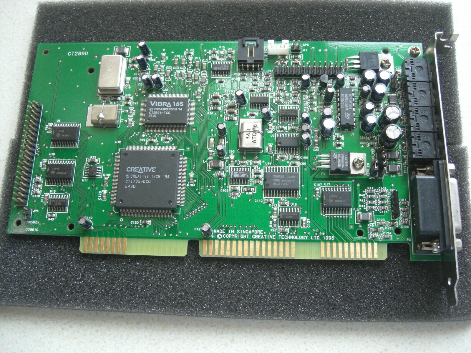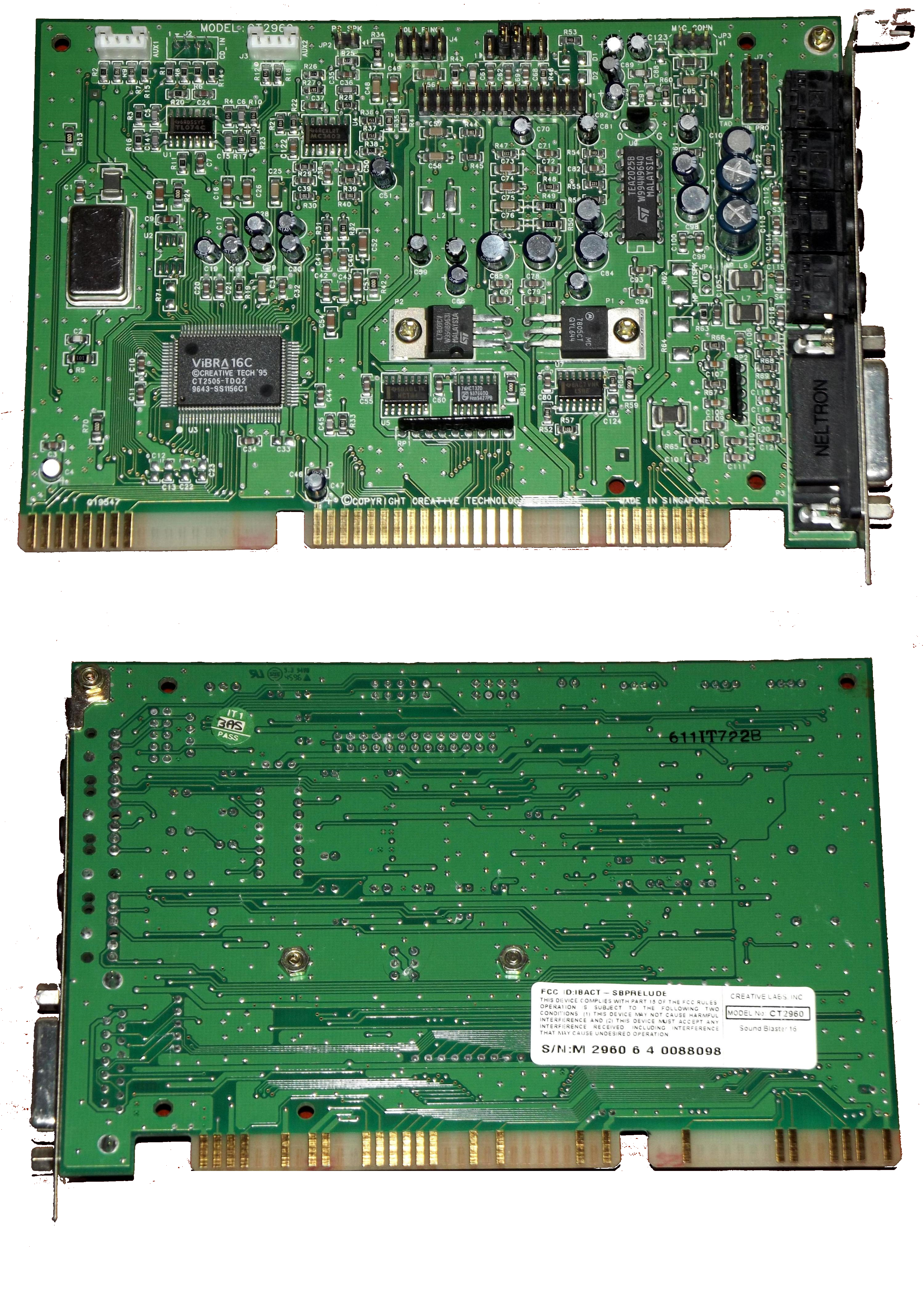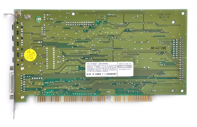 This is a Value edition card and is the OEM version of a CT2959. It has the ViBRA 16S chipset and a real full-size Yamaha YMF262 (OPL3) chip. This was the first Creative card to use their new CT1705 bus interface chip which provided it with full Plug & Play capability. Most other 2nd-generation SB16s had the bus interface logic embedded in the CT1747 chip or in the ViBRA chip (CT2501 or CT2504) on ViBRA cards.