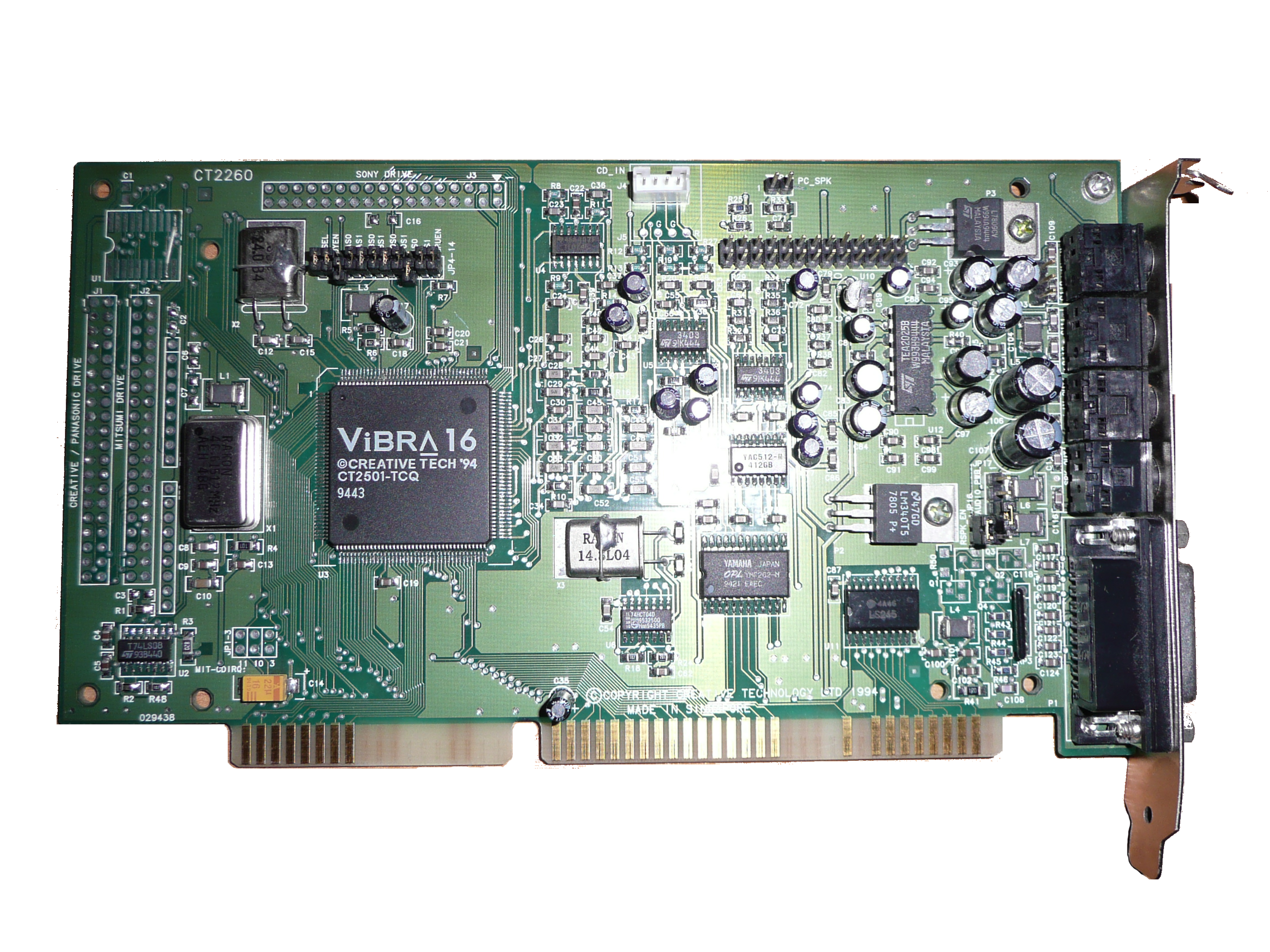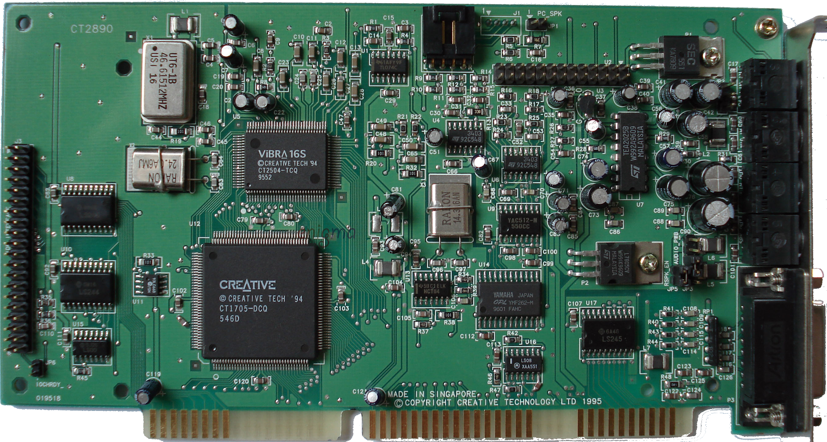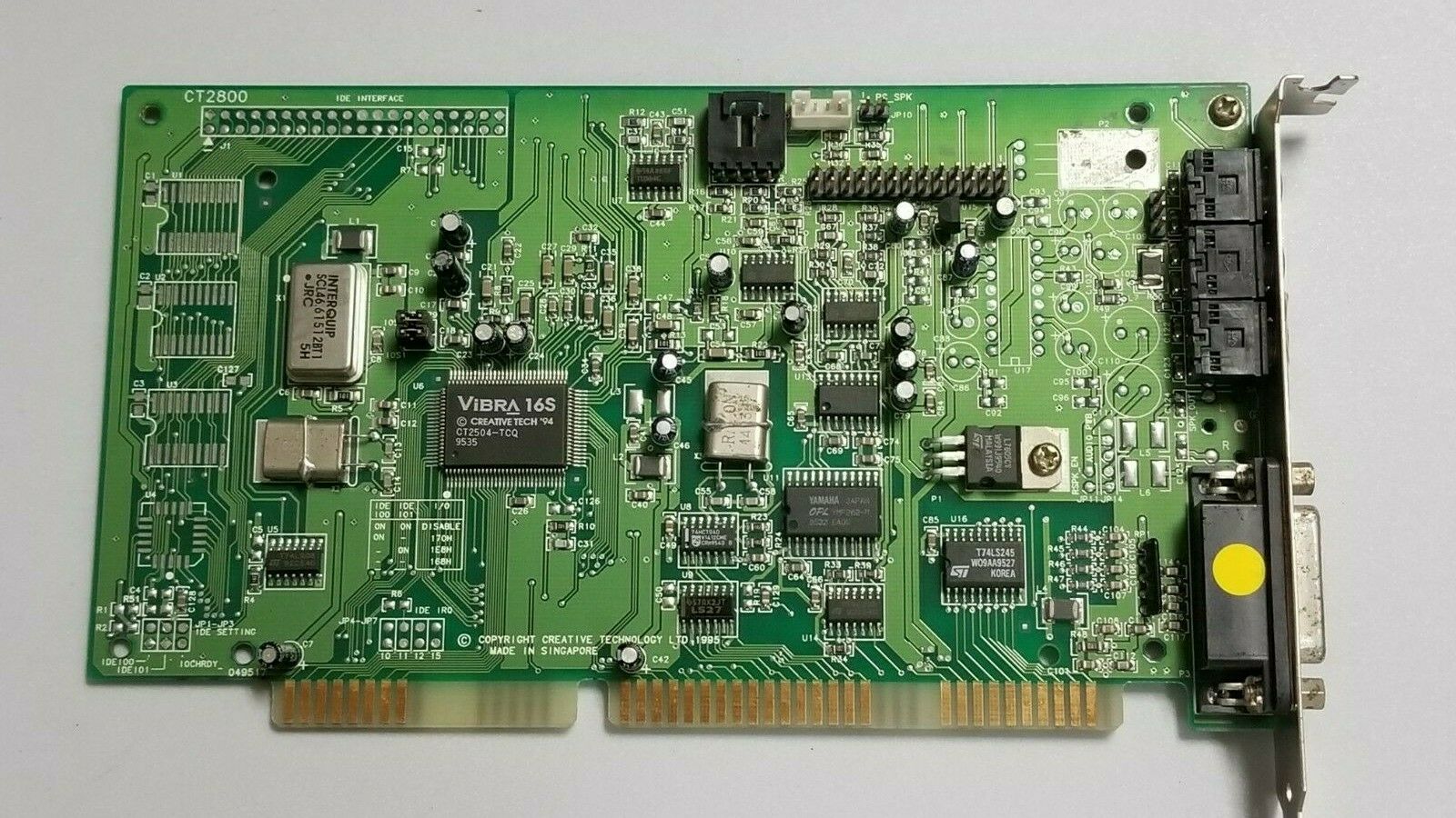 Following the success of the CT2260 and its first ViBRA-16 card, the CT2800 or Sound Blaster Vibra 16S, uses an updated chip - the ViBRA 16S (CT2504). Early ViBRA 16S models still had the Yamaha OPL3 FM synthesizer chip onboard as in the image above, whereas later ViBRA 16S, ViBRA 16C and ViBRA 16XV cards all have the CQM (Creative Quadrature Modulation) chips instead. These were Creative's own take on the Yamaha OPL and are generally considered to be sub-par compared to the Yamaha.