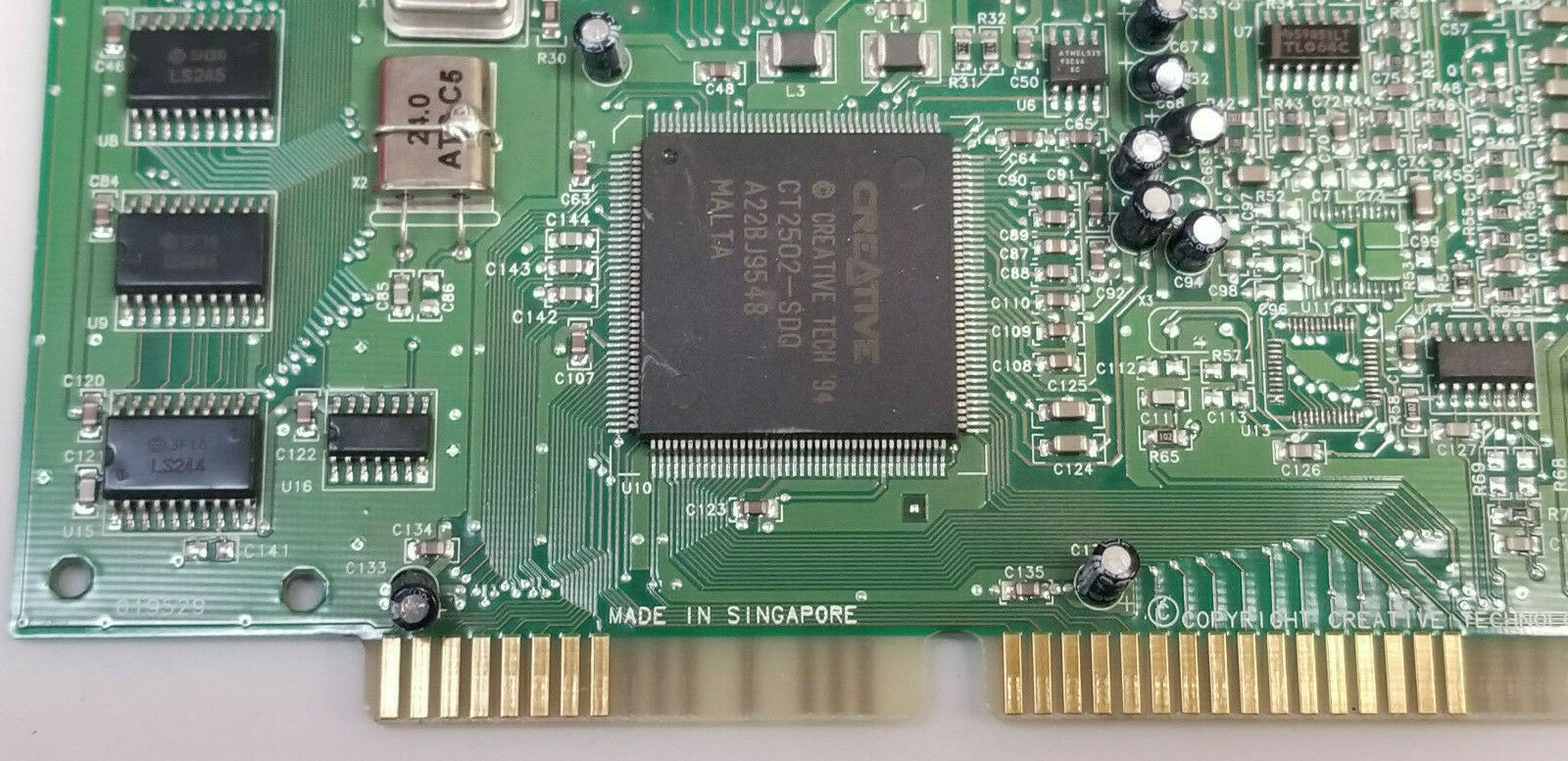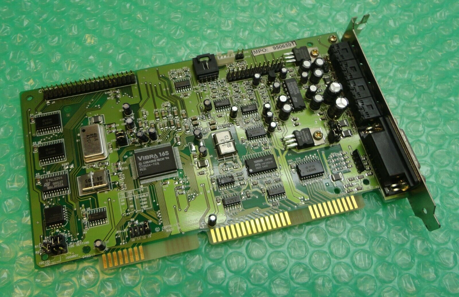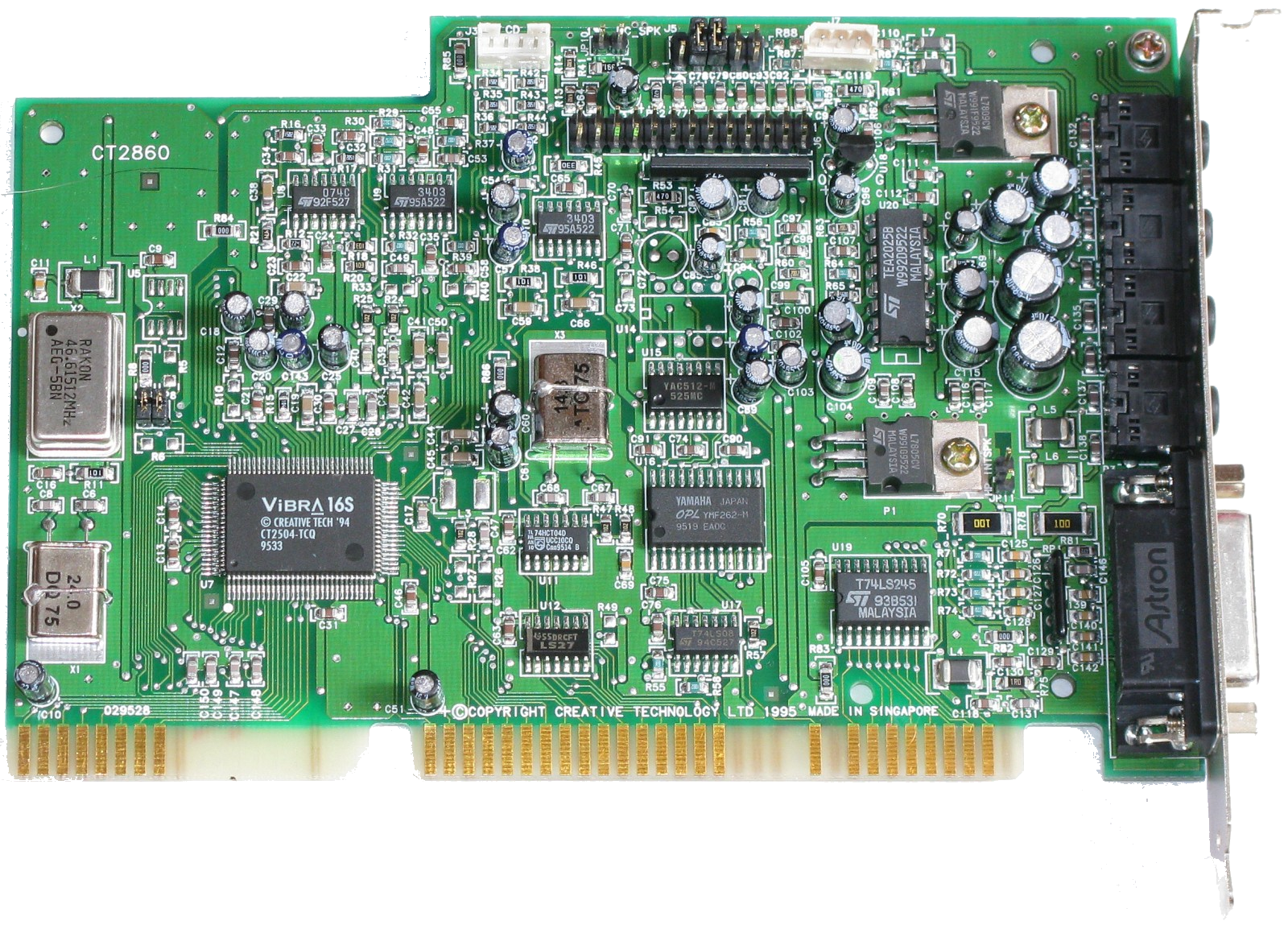 Following the success of the CT2260 and its first ViBRA-16 card, the CT2800 or Sound Blaster Vibra 16S, uses an updated chip - the ViBRA 16S (CT2504). Early ViBRA 16S models still had the Yamaha OPL3 FM synthesizer chip onboard as in the image above, whereas later ViBRA 16S, ViBRA 16C and ViBRA 16XV cards all have the CQM (Creative Quadrature Modulation) chips instead. These were Creative's own take on the Yamaha OPL and are generally considered to be sub-par compared to the Yamaha.
