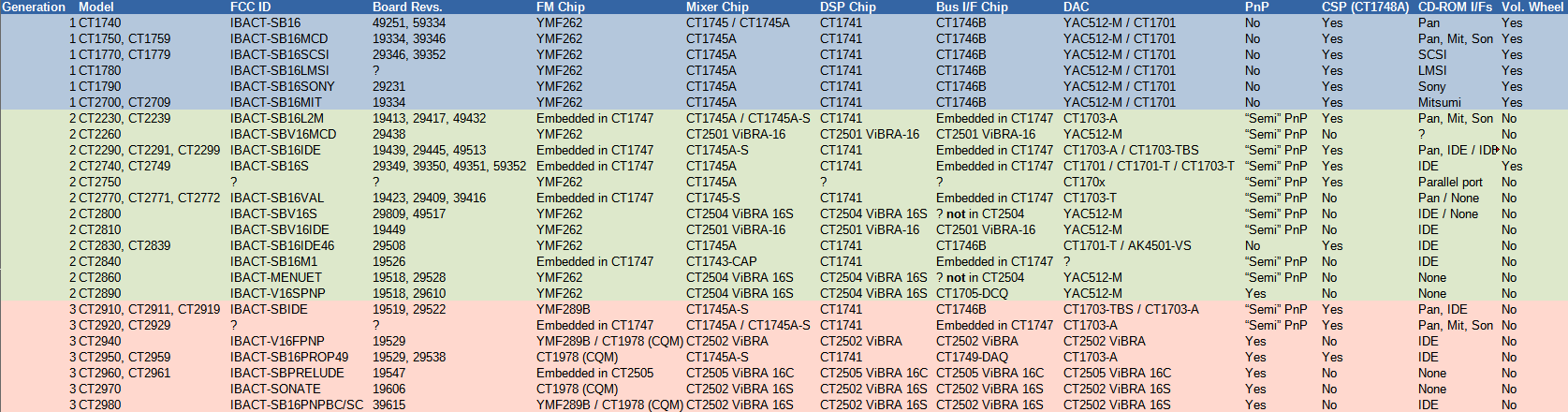 The table below summarises the various Sound Blaster 16 models, in order of generation. Note that the CSP column qualifies as a 'yes' even if the card only has solder pads for the CSP/ASP chip: