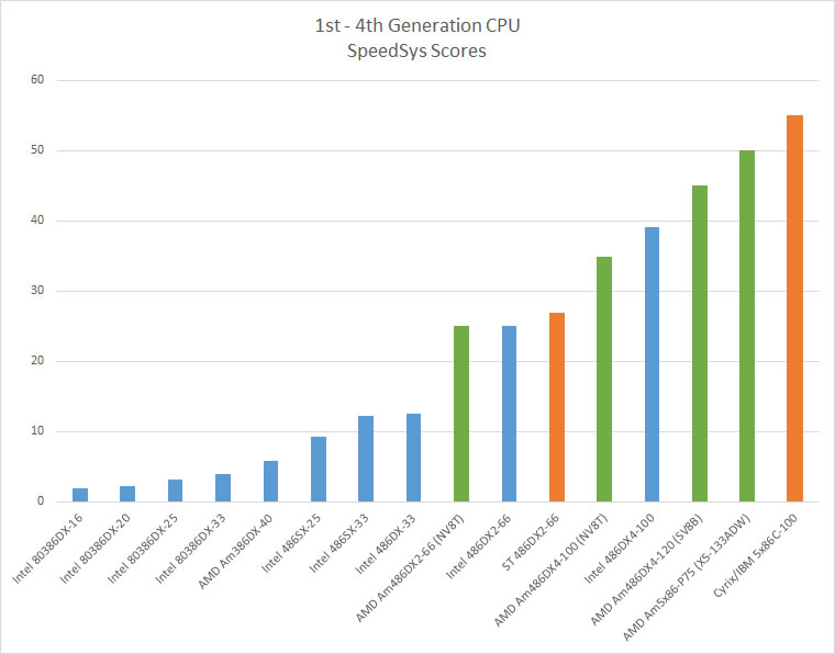 To provide some rough guidance on comparing 486-era (Socket 3) CPUs, the chart below illustrates typical SpeedSys scores for a variety of processors from Intel, AMD and Cyrix. Since IBM, Texas Instruments and ST were authorised rebrands of Cyrix processors, you can use the closest Cyrix chip for reference.