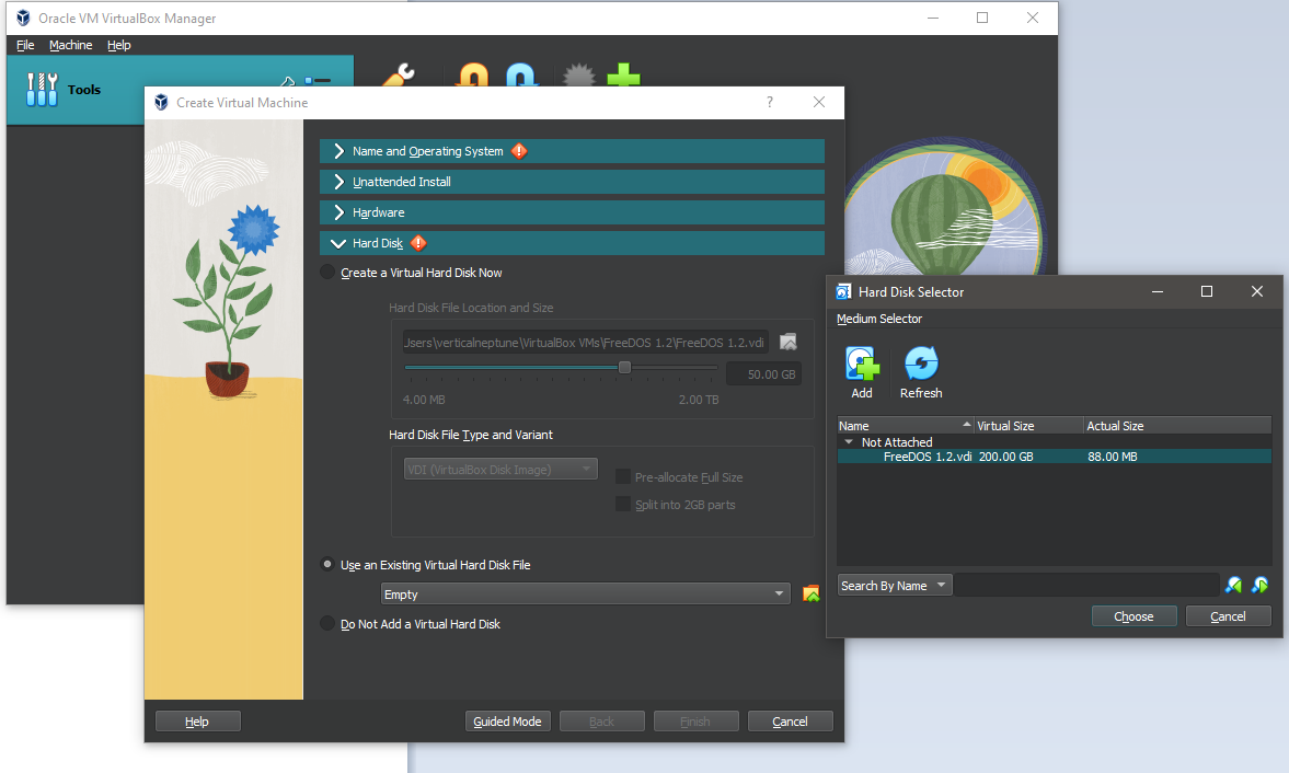 At the time of this article, VirtualBox 7.0.6 is the latest version. The binaries are released under the terms of the GPL version 3. With VirtualBox, typically the entire virtual guest operating system is stored within a single file, called a .VDI file (VirtualBox Drive Image). You can very quickly create a new Virtual Machine, select that it's a DOS machine, add a virtual hard disk to the machine (point it to a .VDI file), and that's really all there is to the most basic setup needed.