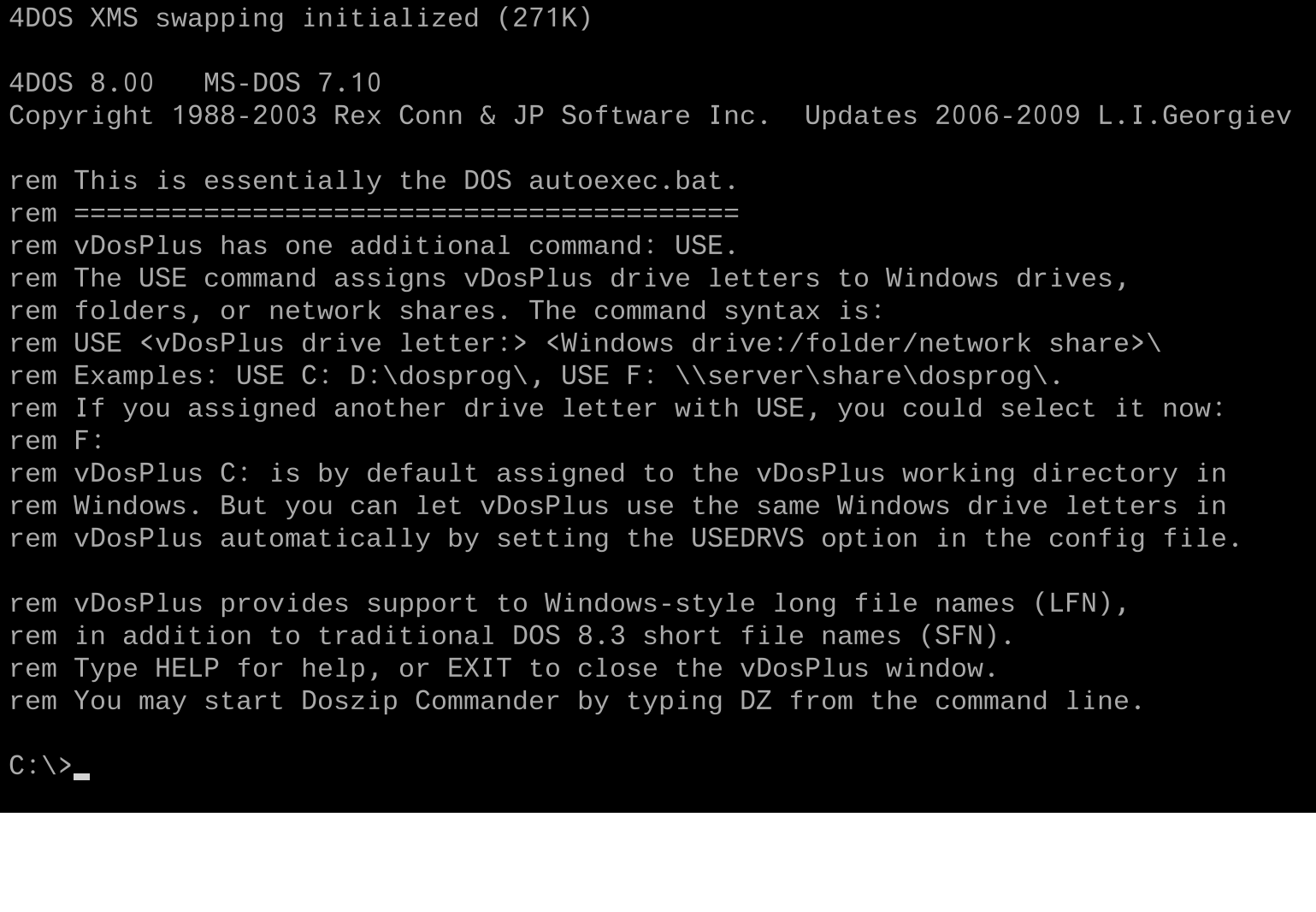 vDosPlus comes with built-in support for multiple monitors as well as XMS and EMS memory capabilities. It is highly configurable both visually and in terms of what a typical application will 'see' - the reported DOS version can be changed, for instance. It has the excellent 4DOS DOS extender automatically built-in which has been around since the DOS days and provides an additional set of useful tools at the command-line.