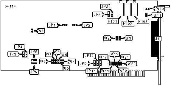 A total of 256 base address settings are available. The jumpers are a binary representation of the decimal memory addresses. W9 is the Most Significant Bit and switch W4 is the Least Significant Bit. The switches have the following decimal values: W9=512, W8=256, W7=128, W6=64, W5=32, W4=16. Turn off the switches and add the values of the switches to obtain the correct memory address. (Close=1, Open=0)