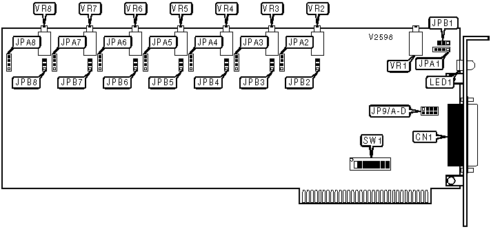 Note: A total of 64 base address settings are available. The switches are a binary representation of the decimal memory addresses. SW1/1 is the Most Significant Bit and switch SW1/6 is the Least Significant Bit. The switches have the following decimal values: SW1/1=512, SW1/2=256, SW1/3=128, SW1/4=64, SW1/5=32, SW1/6=16. Turn off the switches and add the values of the switches that are off to obtain the correct memory address. (Off=1, On=0)