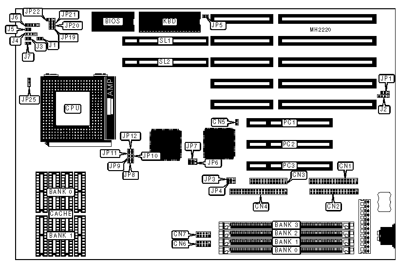 32-bit PCI slots (3), 32-bit VESA local bus slots (2), floppy drive interfaces (2), green PC connector, IDE interface, parallel port, serial ports (2)