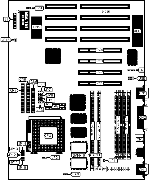 32-bit PCI slots (4), floppy drive interface, green PC connector, IDE interfaces (2), parallel port, PS/2 mouse port, serial ports (2), IR connector, USB connector, ATX power connector