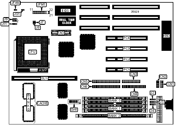 Note: Bank 2 only accepts DIMM modules. It is optional and may not be present. Board accepts x 32 SIMMs.