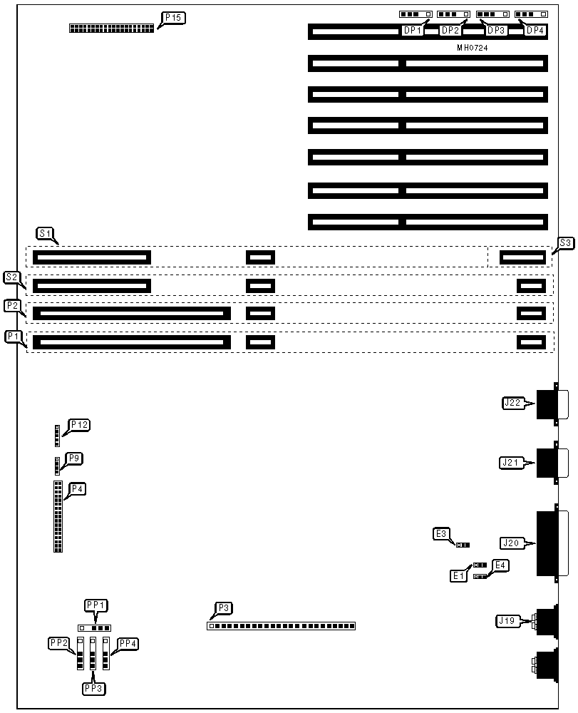 System processor card slot, system processor card/Proprietary expansion card slot, 32-bit system memory card, 32-bit external memory card, VGA port, parallel port, serial port, bus mouse port, IDE interface, floppy drive interface |