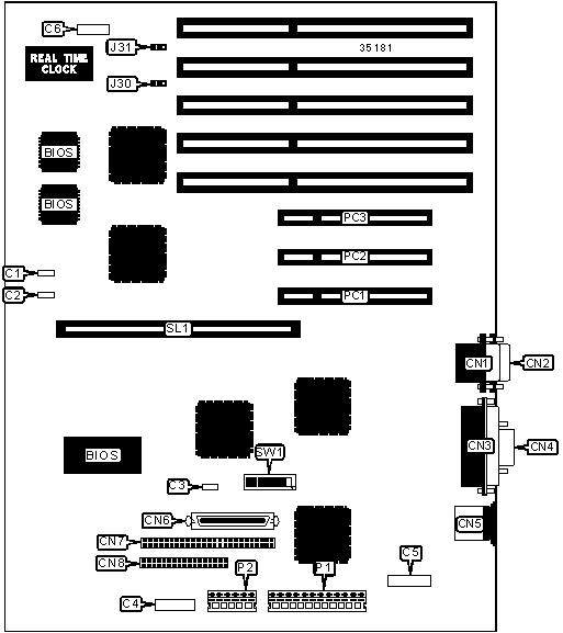 32-bit PCI slots (3), floppy drive interface, SCSI interface, Wide Ultra SCSI interface, parallel port, PS/2 mouse port, serial ports (2), VGA port, CPU slot |