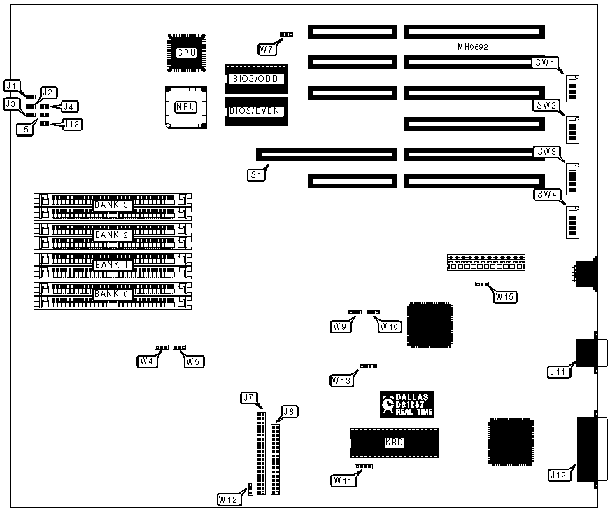 Note:The locations of jumpers W1, W2, W3, & W6 are unidentified. | |||