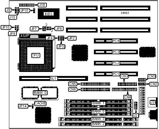 Note: Board accepts EDO memory. Board also accepts x 32 SIMMs. Memory installed in Banks 1 & 2 is interchangeable. | ||