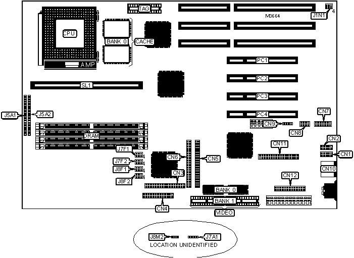 Note: Board accepts EDO memory. The location of banks 0 & 1 are unidentified. Board also accepts x 36 SIMMs. | ||