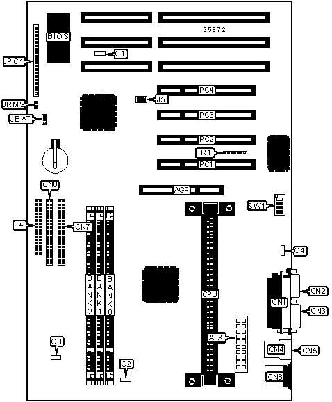 32-bit PCI slots (4), floppy drive interface, green PC connector, IDE interfaces (2), parallel port, PS/2 mouse port, serial ports (2), IR connector, USB connectors (2), ATX power connector, AGP slot, SB-link connector |