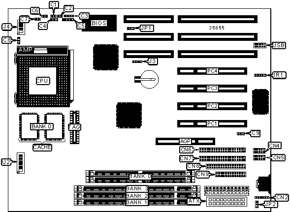 32-bit PCI slots (4), floppy drive interface, IDE interfaces (2), parallel port, PS/2 mouse interface, serial ports (2), IR connector, USB connector, ATX power connector, AGP slot
