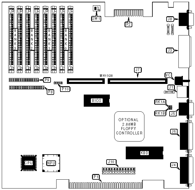 Floppy drive interfaces (2), IDE interface, parallel port, serial ports (2), VGA port |