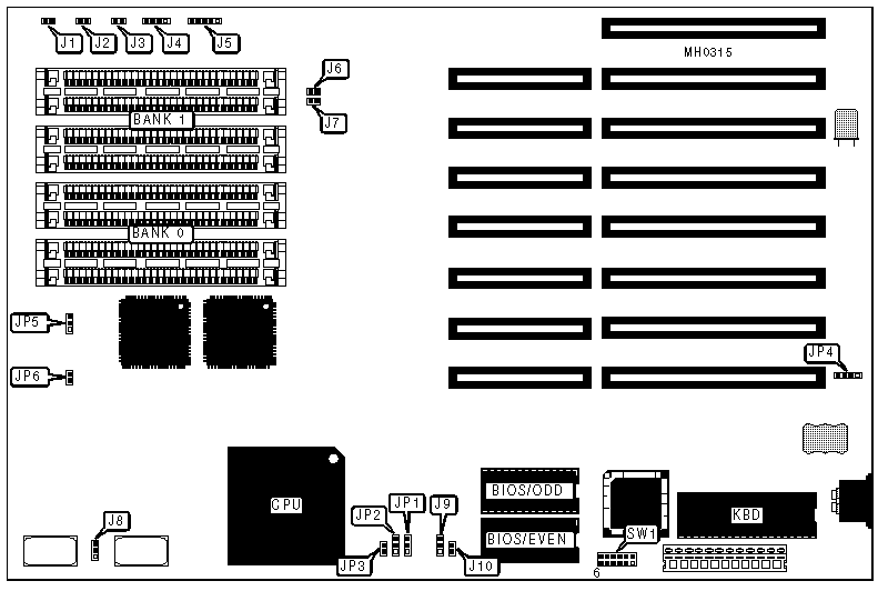 Note:Location of JP6 is unverified. If using 8 bit SIMMs, J6 must be open. | |||