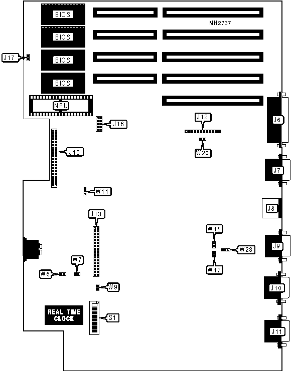 bus mouse port, floppy drive interface, game port, green PC connector, IDE interface, parallel port, PS/2 mouse port, serial port, EGA/TTL port, VGA port |
