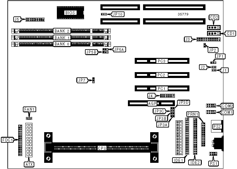 32-bit PCI slots (3), floppy drive interface, IDE interfaces (2), parallel port, PS/2 mouse port, PS/2 mouse interface, serial ports (2), ATX power connector, AGP slot, audio in – CD-ROMs (2)