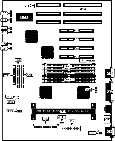 32-bit PCI slots (4), floppy drive interface, green PC connector, IDE interfaces (2), parallel port, PS/2 mouse port, serial ports (2), IR connector, VRM connector, USB connector, ATX power connector