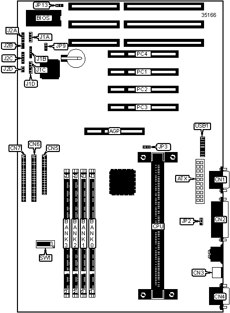 32-bit PCI slots (4), floppy drive interface, IDE interface (2), parallel port, PS/2 mouse port, serial ports (2), USB connector (2), IR connector, AGP slot, green PC connector, ATX power connector