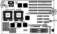 Ethernet 10BaseT connector, floppy drive interface, green PC connector, IDE interfaces (2), SCSI interface, parallel port, PS/2 mouse port, serial ports (2), VGA feature connector, VGA port, riser slot