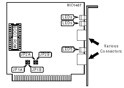 Note:On NICs that have twisted pair connectors LED 4 designates the state of the connection, while on NICs that do not have twisted -pair connectors LED 4 indicates if power is applied to the card. LED 5 is present only on cards that have two RJ-45 connectors. | |||