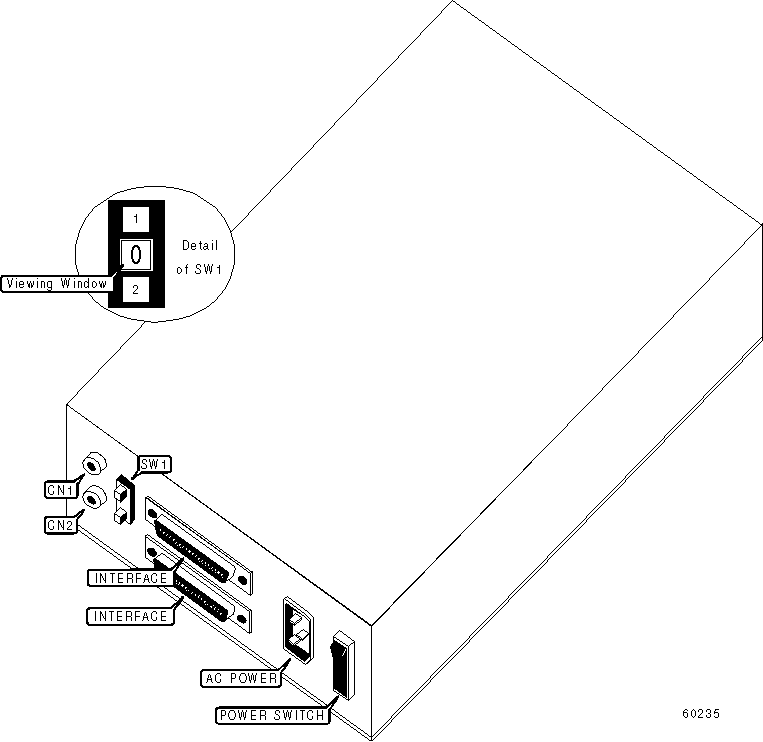 Note: Push SW1/button 1 to select a lower SCSI ID number. Push SW1/button 2 to select a higher SCSI ID number. If number shown in viewing window is ‘0’ do not push button 1. If number shown in viewing window is 7, do not push button 2. | |