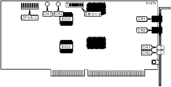 Note: A total of 95 memory base address settings are available. The switches are a binary representation of the hexadecimal addresses. Switch 7 is the Least Significant Bit and switch 1 is the Most Significant Bit. The switches have the following hexadecimal values: switch 1=200h, 2=100h, 3=80h, 4=40h, 5=20h, 6=10h, 7=8h. Add the On switches to obtain the correct memory base address. (On=1, Off=0) Set Switch 8 to Off.