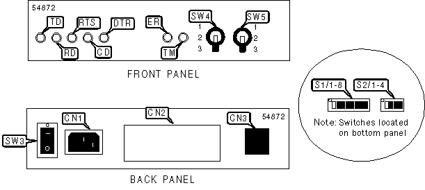AC power connector, DTE/DCE serial port, network interface via RJ-45 connector |