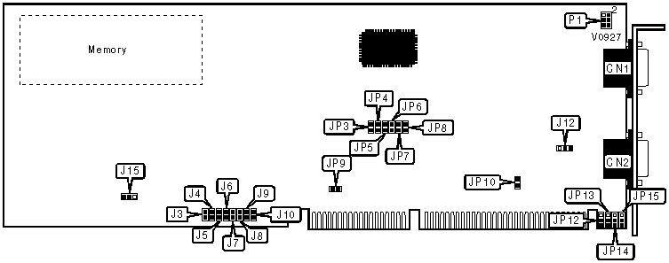 Note: A total of 255 base address settings are available. The jumpers are a binary representation of the decimal memory addresses. Jumper J3 is the Most Significant Bit and jumper J10 is the Least Significant Bit. The jumpers have the following decimal values: jumper J3=524288, J4=262144, J5=131072, J6=65536, J7=32768, J8=16384, J9=8192, J10=4096. Open the jumpers and add the values of the open jumpers to obtain the correct memory address. (open=1, closed=0) | ||||||||