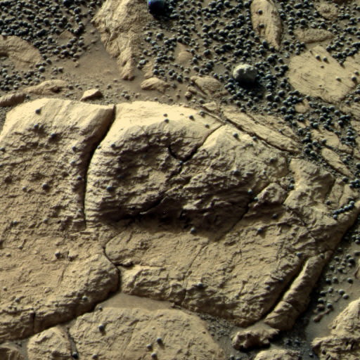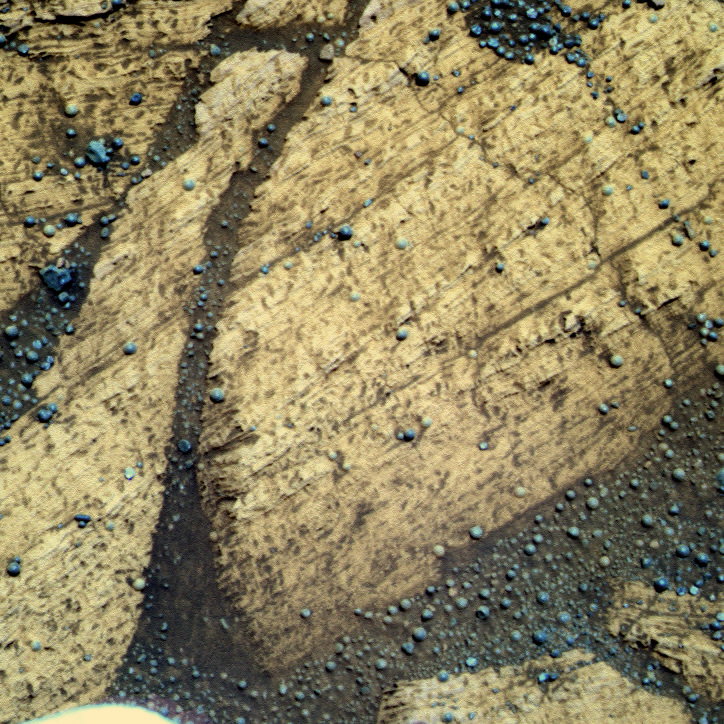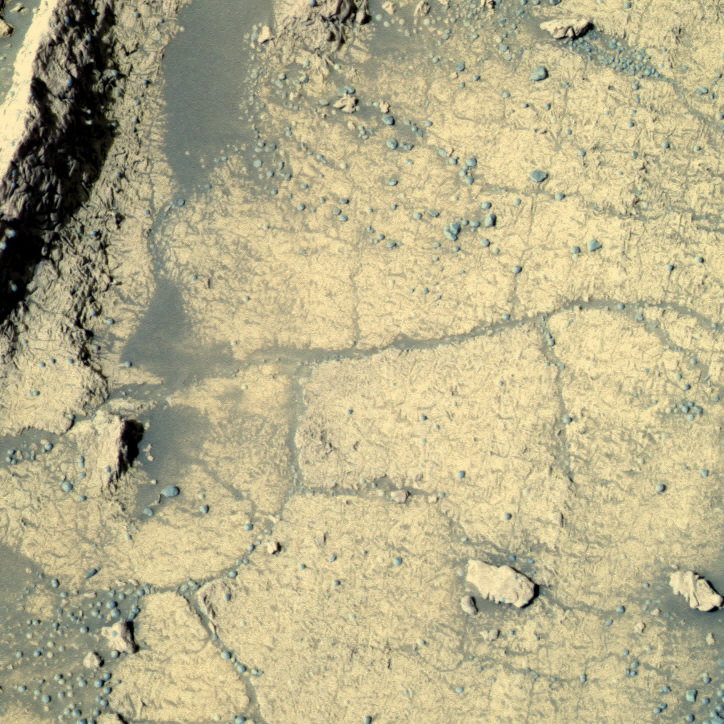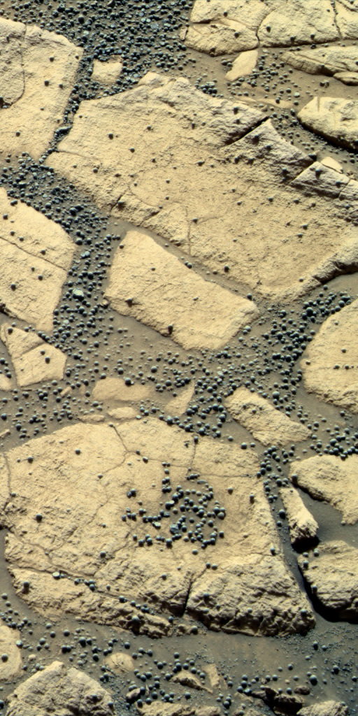 The sphere-like grains or "blueberries" distributed throughout the outcrop can be seen lining up with individual layers. This observation indicates that the spherules are geologic features called concretions, which form in pre-existing wet sediments. Other sphere-like grains, such as impact spherules or volcanic lapilli (fragments of material between 2 and 64 millimeters or .08 and 2.5 inches in maximum dimension that are ejected from a volcano) are thought to be deposited with sediments and thus would form layers distinct from those of the rocks.