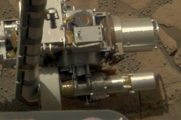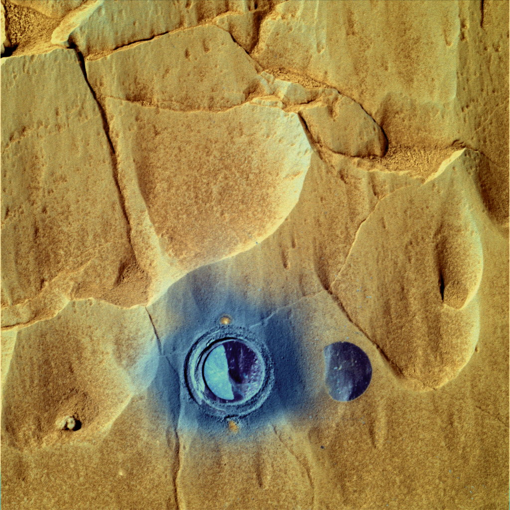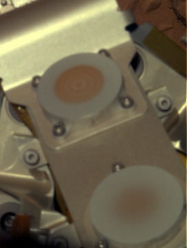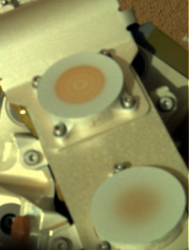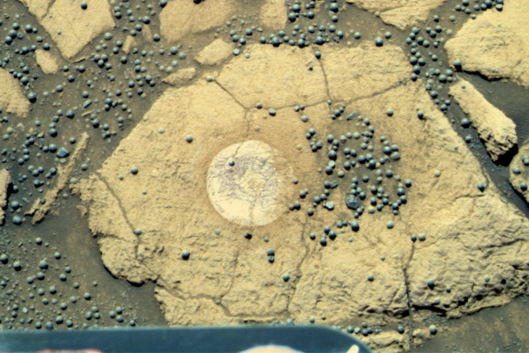 Scientists believe that the spherule or "blueberry" in the upper right area of the circular impression was sliced in half by the rock abrasion tool. "Blueberries" are a known obstruction to the grinding tool that cause it to terminate its sequence. Despite the stall, the rock abrasion tool abraded "Flatrock" for one hour and five minutes, producing a cavity ripe for investigation.